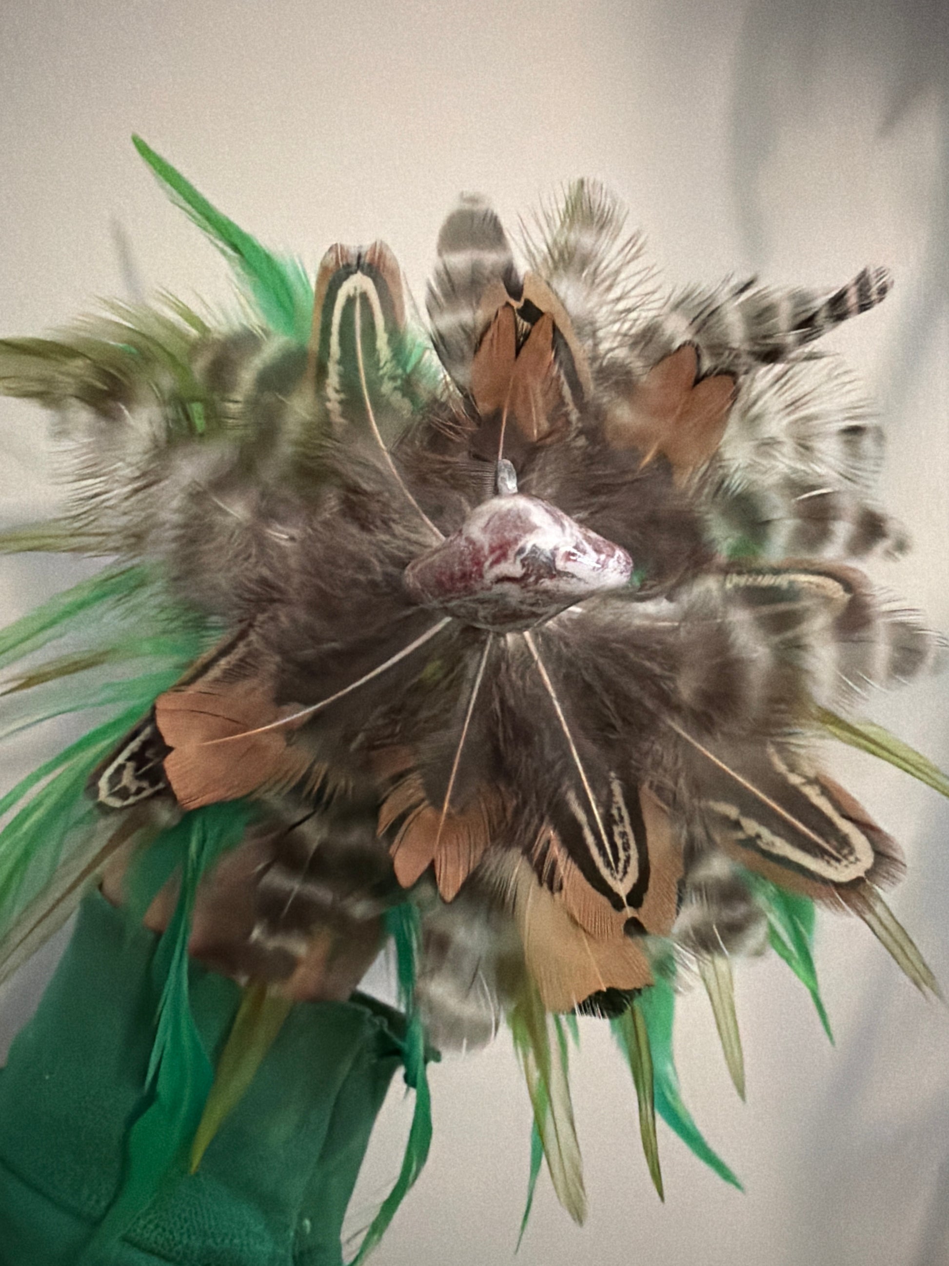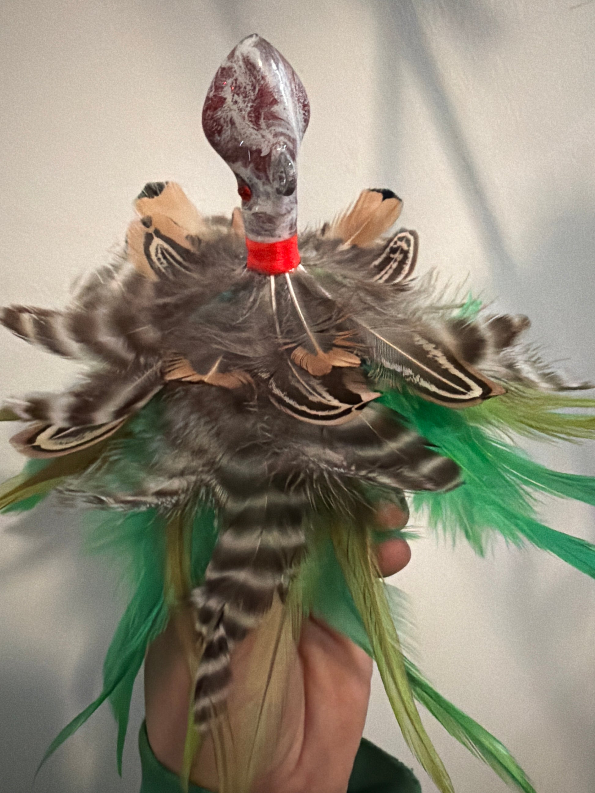 2 oz. 9/0 hook. Double rattle epoxied to the hook shaft. Uv resin for extreme durability. Gettin Jiggy style paint.